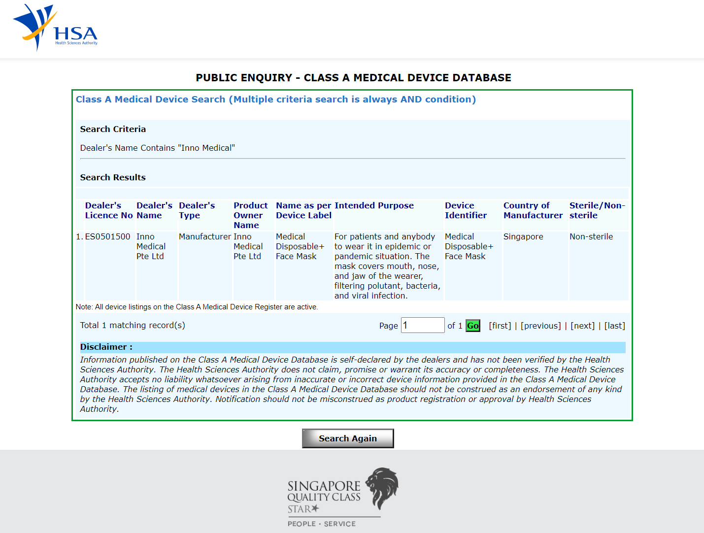 Made in Singapore HSA Licensed Disposable MEDICAL MASK, 50pcs/box